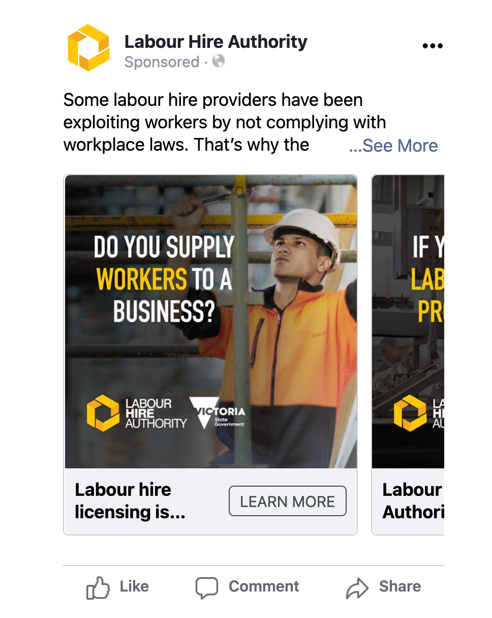 BRAVE created this integrated marketing campaign for the Government of Victoria, launching the newly established Labour Hire Authority. The campaign involved brand mark design, market research and marketing strategy, print, radio and social executions. BRAVE also designed the functionality of the LHA’s website.